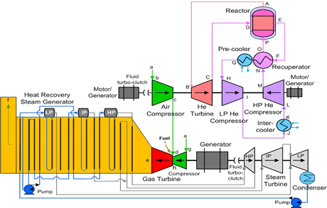 The hybrid-nuclear/Natural Gas Combined-cycle (NGCC) power plant can produce over 850 megawatts of power at efficiencies exceeding 52% with emissions about half those emitted by conventional NGCC plants.
